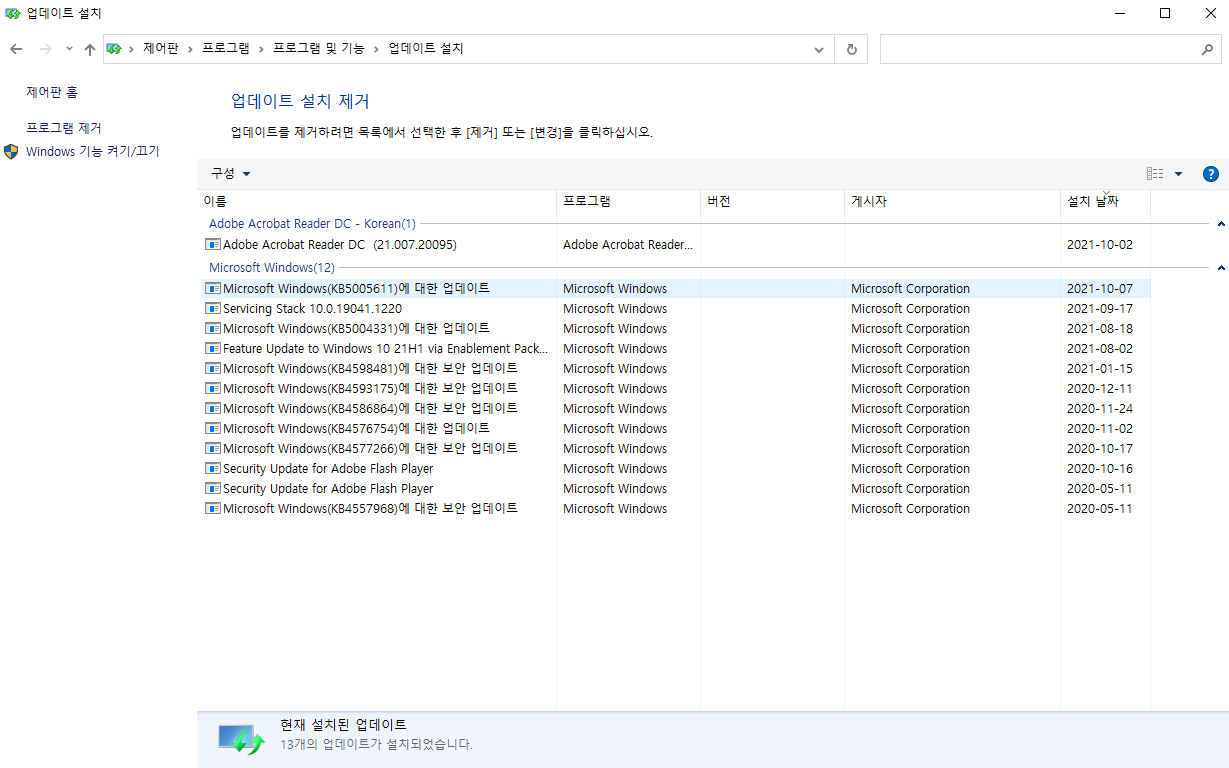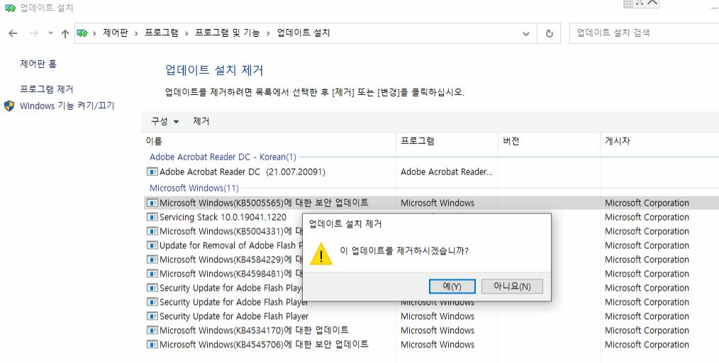 아래와 같은 방법으로 설치된 업데이트를 삭제해 해결합니다
