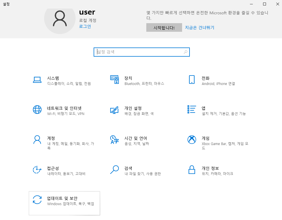 "업데이트 및 보안" 클릭