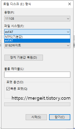 exFAT, NTFS 방식만 선택 가능합니다